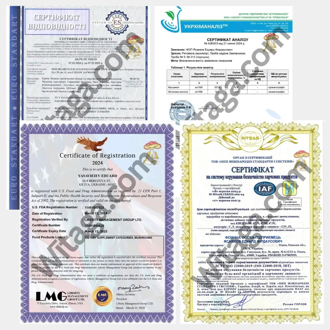 Our dedication to high standards is also confirmed internationally — our products are certified by the FDA (U.S. Food and Drug Administration), proving compliance with globally recognized safety and quality requirements. We are proud that TM Witaga is the first mushroom product brand in Ukraine, offering the world’s most extensive selection of mushroom-based goods, including cosmetics, tinctures, and confections.