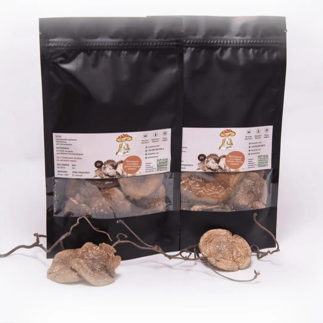Our Pаntherina are responsibly foraged from pristine forest regions, then dried at low temperatures to preserve their natural complexity. This rare species is known for its deep-rooted place in traditional mycological collections. Every batch is processed in Ukraine's first ISO 22000:2019-certified mushroom facility and tested for quality, purity, and authenticity.